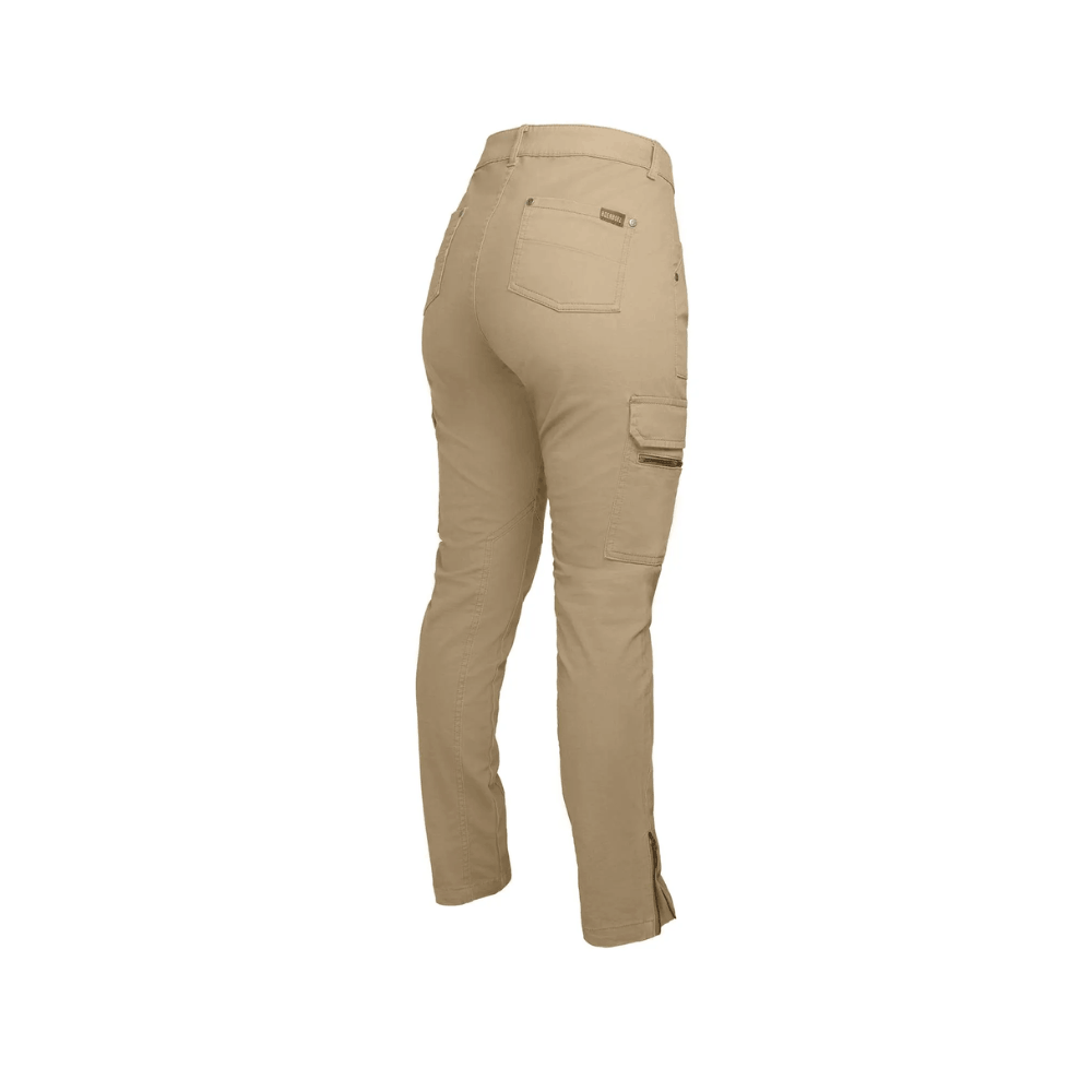 The Ladies Kalahari Cargo Pants – Khaki combine military-inspired style with everyday comfort. Made from luxurious cotton stretch fabric, these ladies cargo pants provide a classic fit that moves with you throughout the day. With eight functional pockets, they offer plenty of storage for essentials while maintaining a sleek look. Branded brass rivets, an embroidered logo, and ankle zip details add a bold, modern edge. Perfect for work, travel, or outdoor adventures, these versatile khaki cargo pants easily transition from professional wear to rugged exploration.