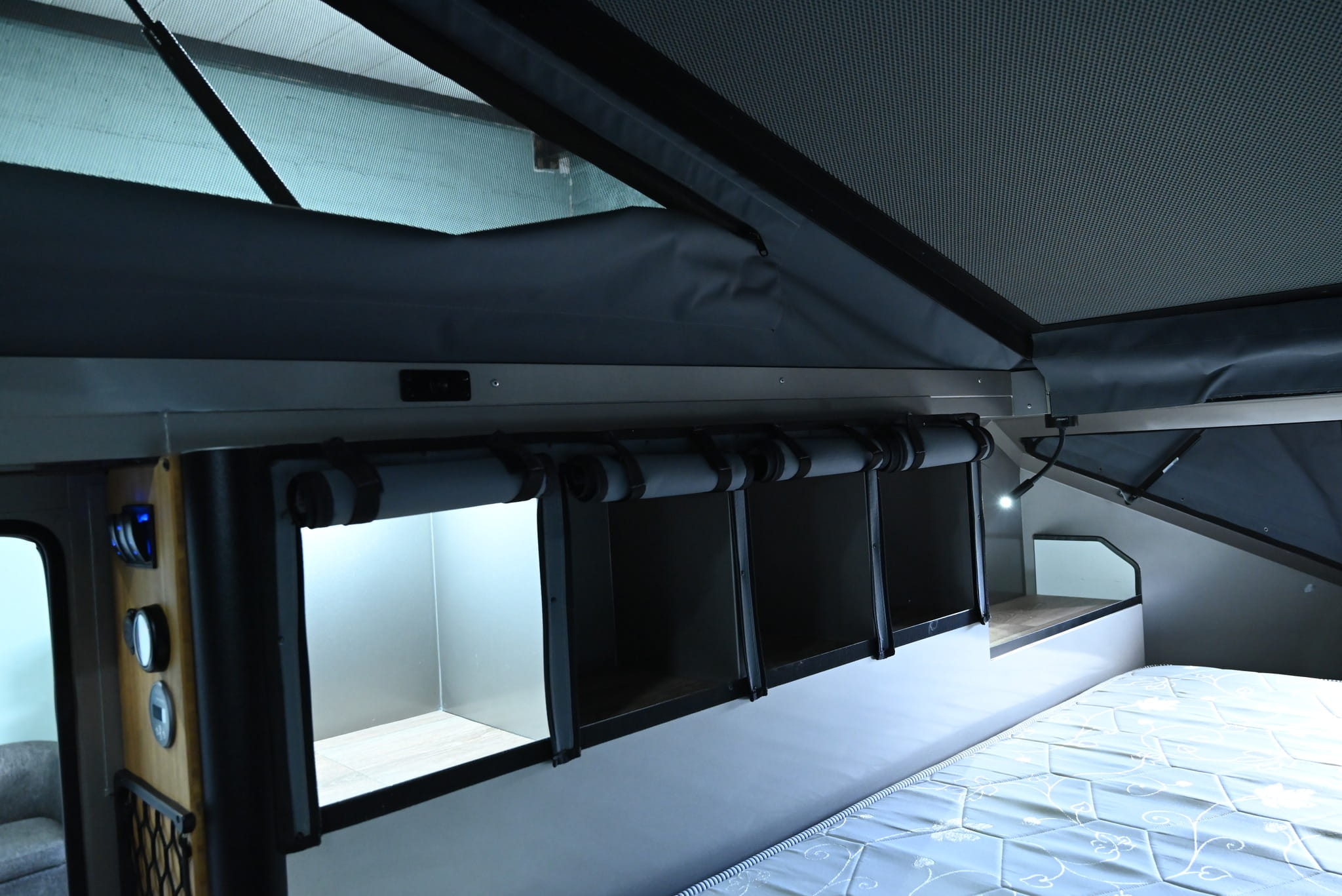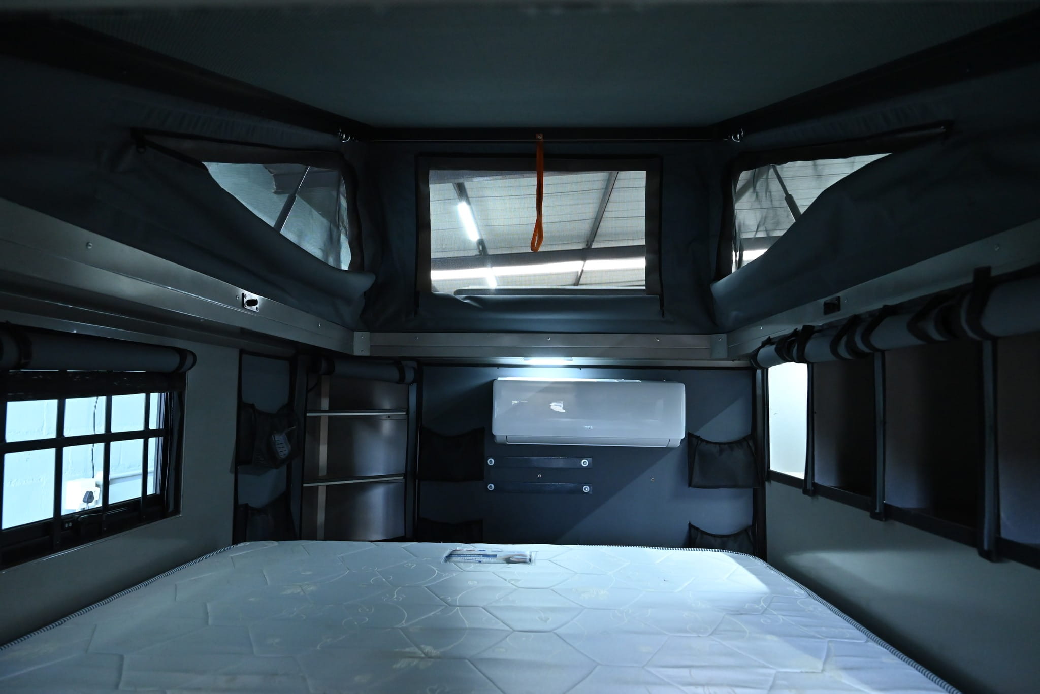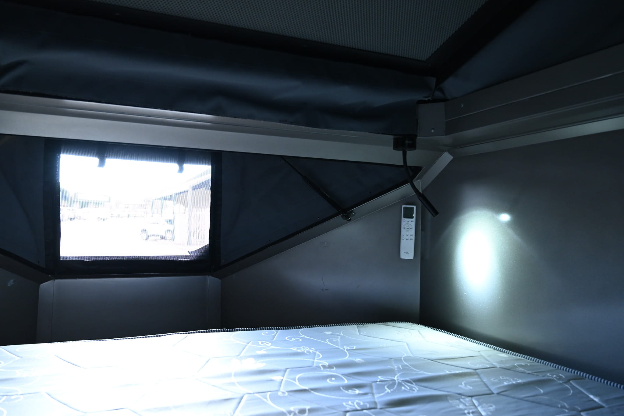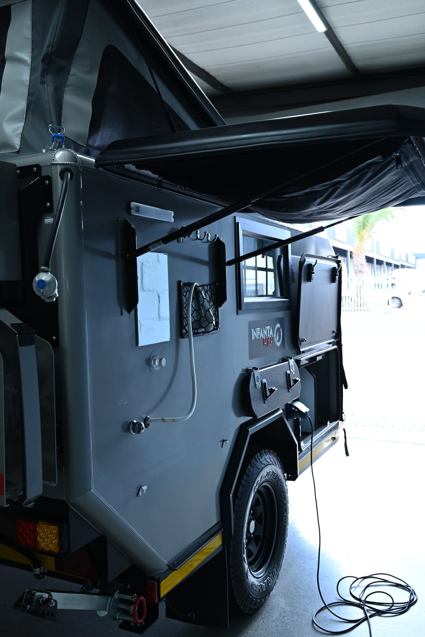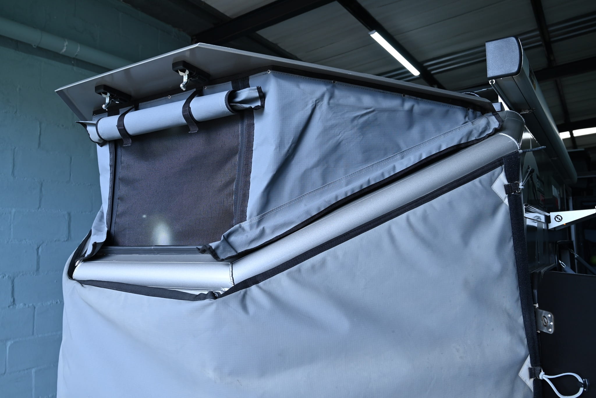 Caravan fitted with gas strut shocks lifters for roof with large windows in canvas with mesh