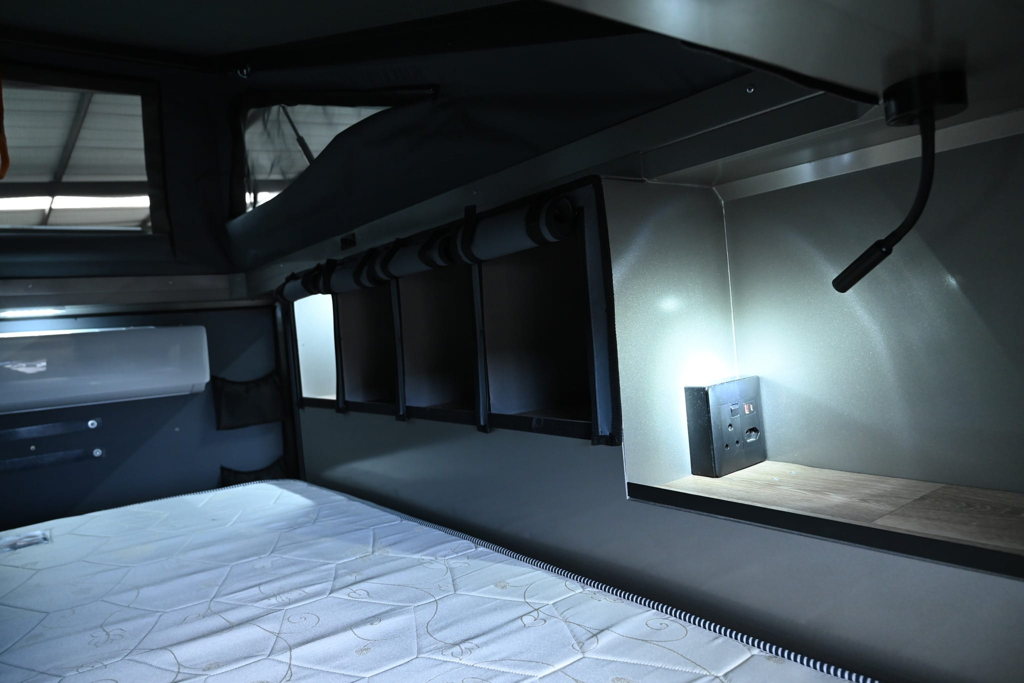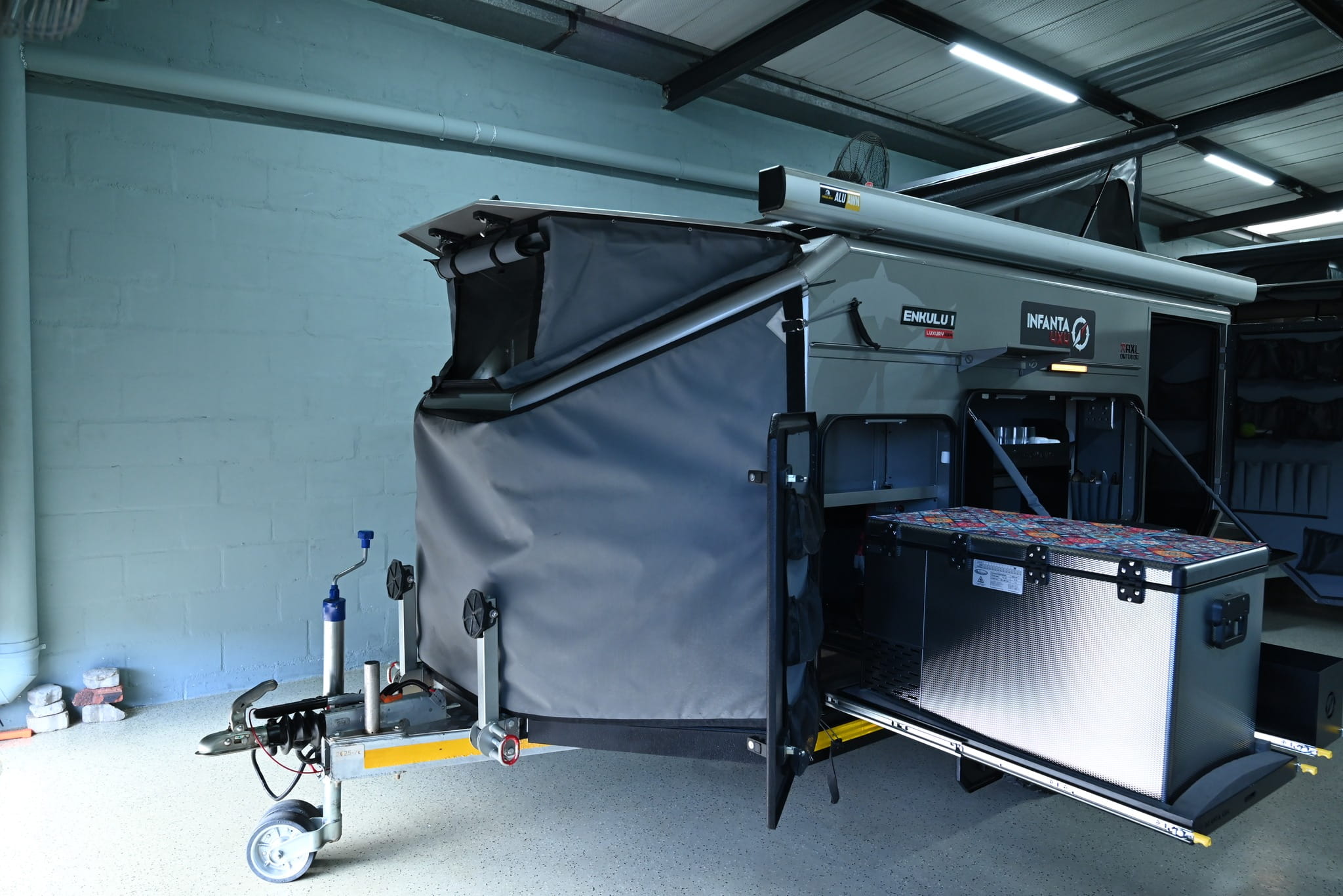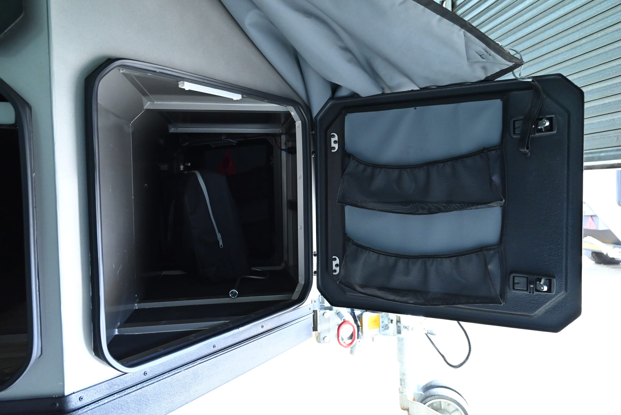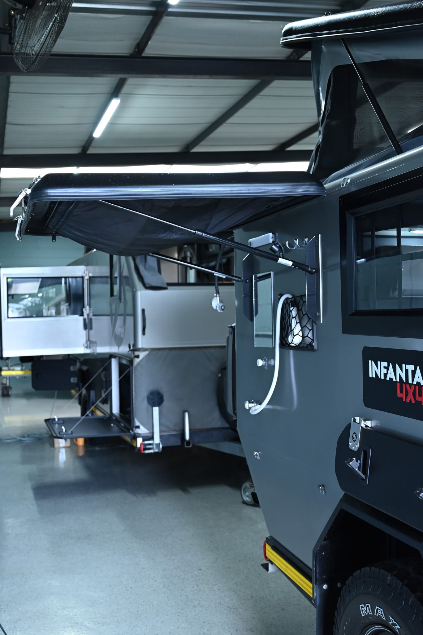 Caravan fitted with gas strut shocks lifters for roof with large windows in canvas with mesh