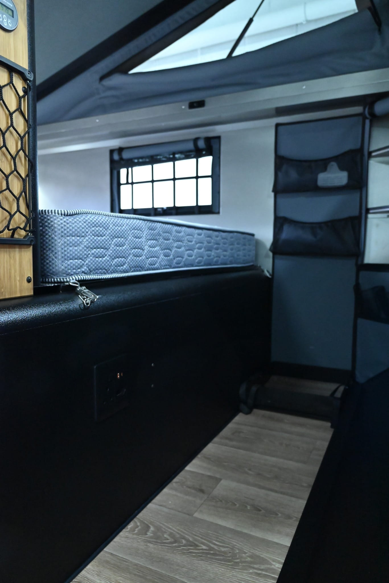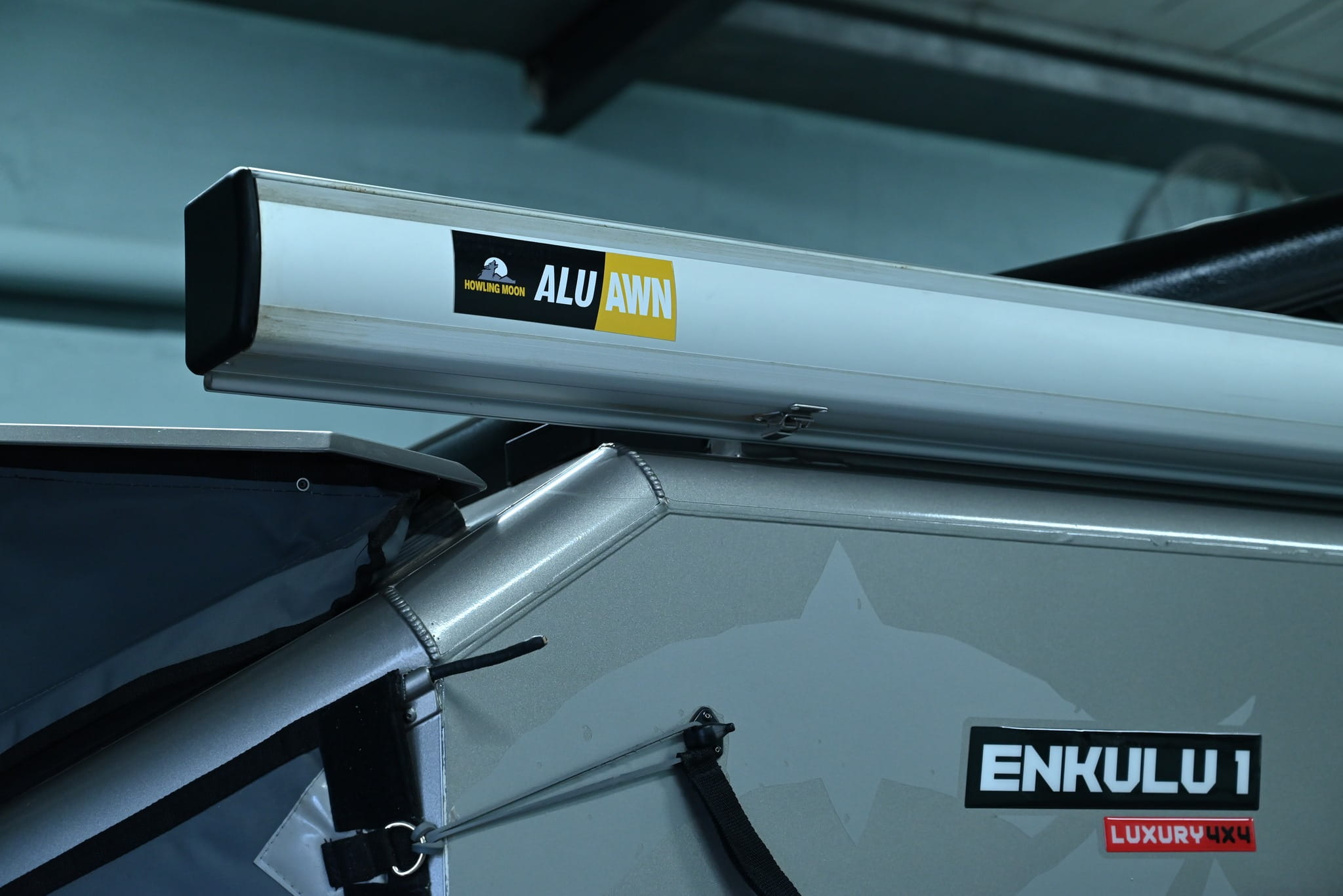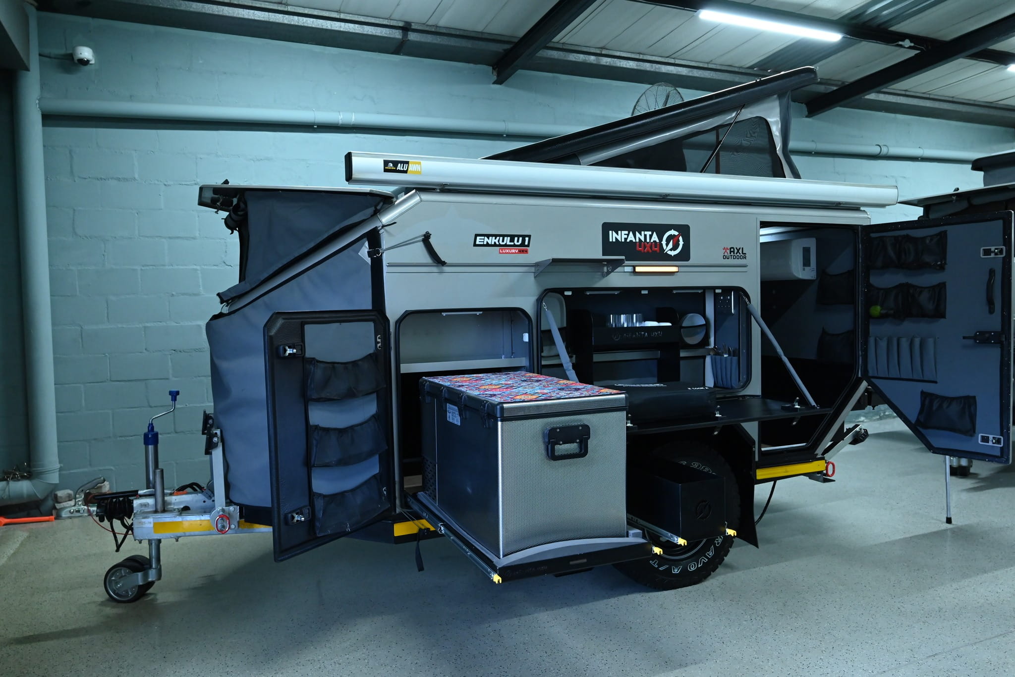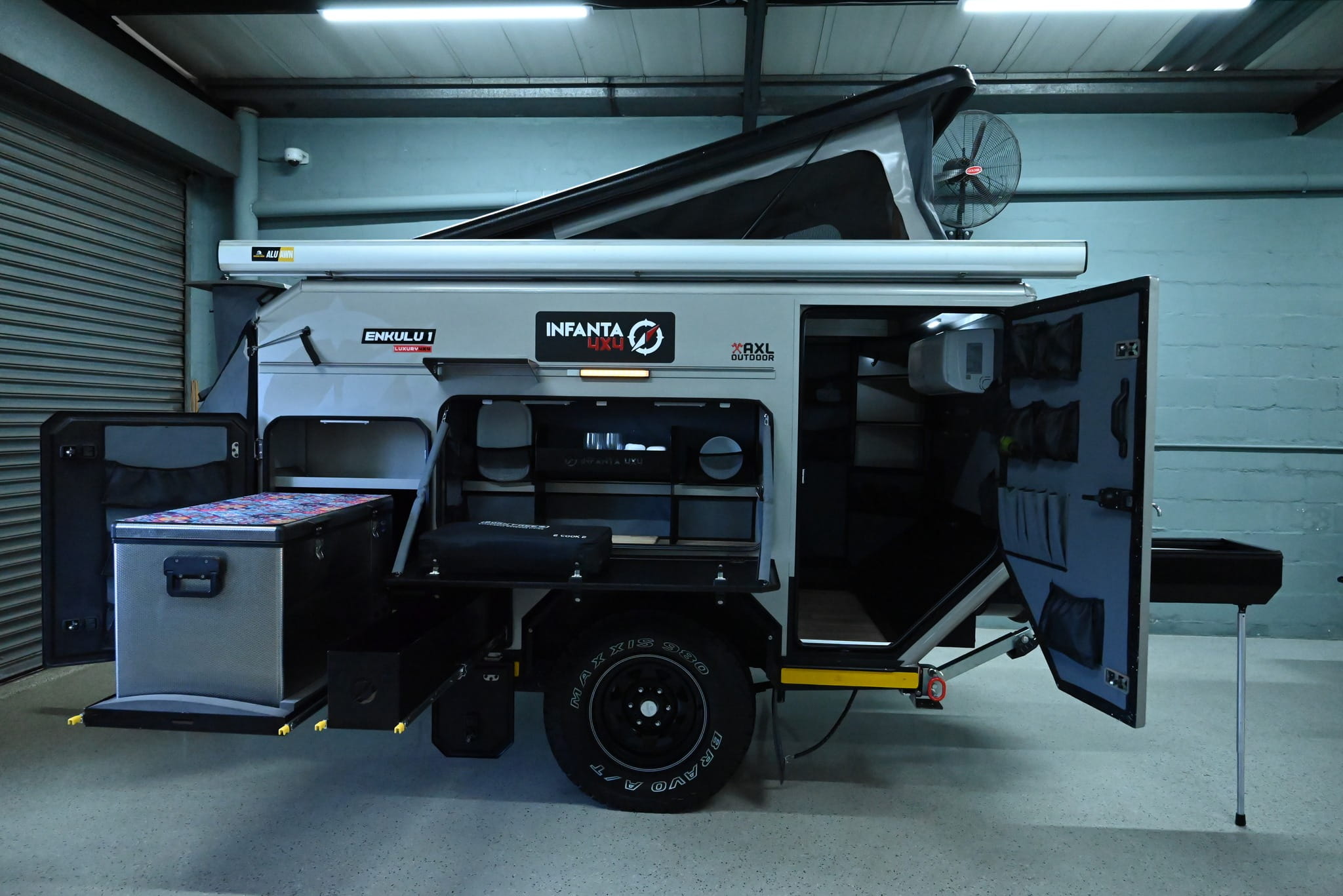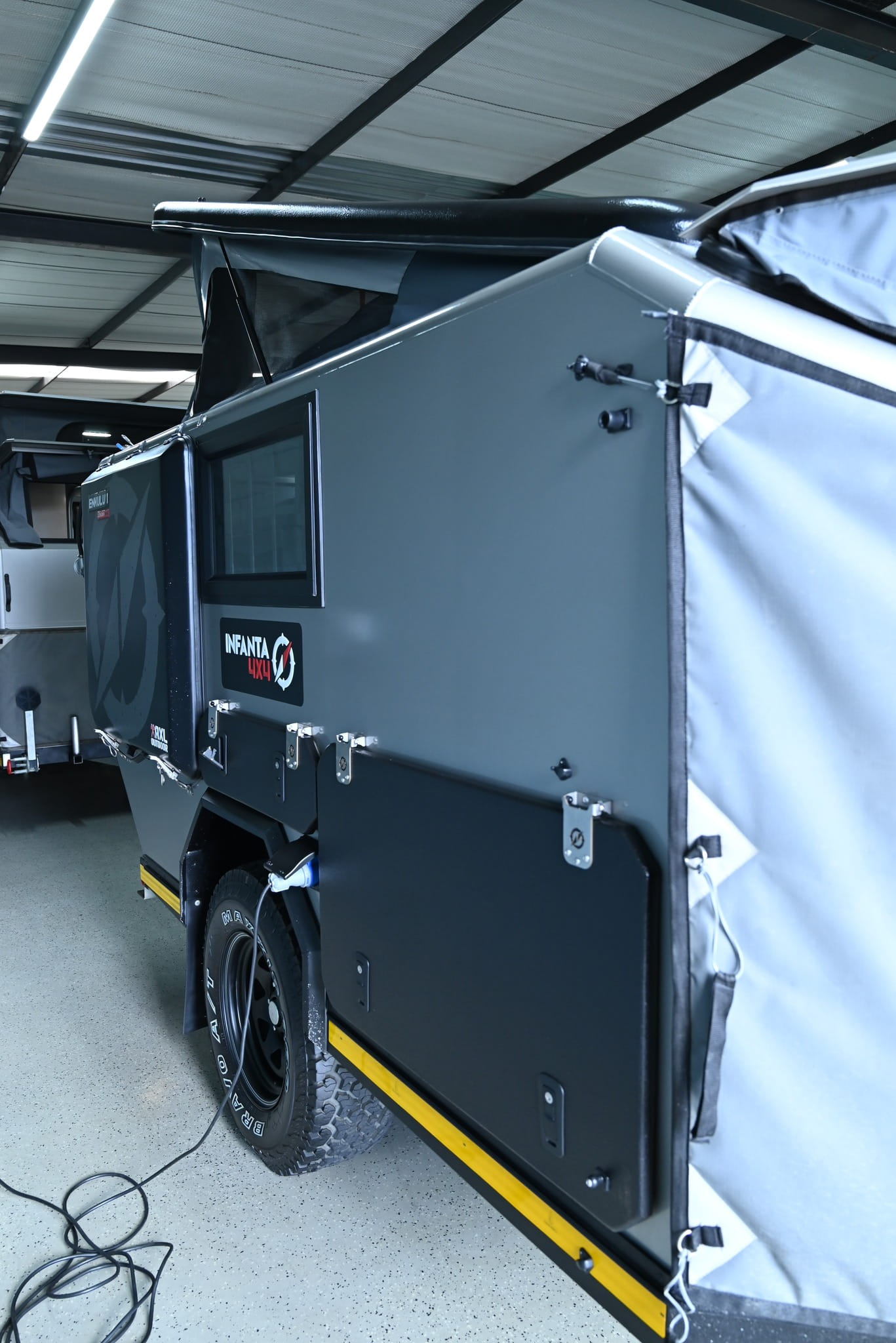 Caravan fitted with gas strut shocks lifters for roof with large windows in canvas with mesh