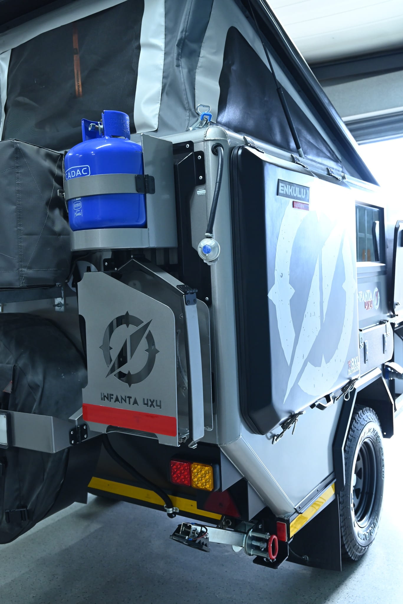 1 x 5kg Gas cylinder + bracket fitted at rear + gas lines to geyser and stove